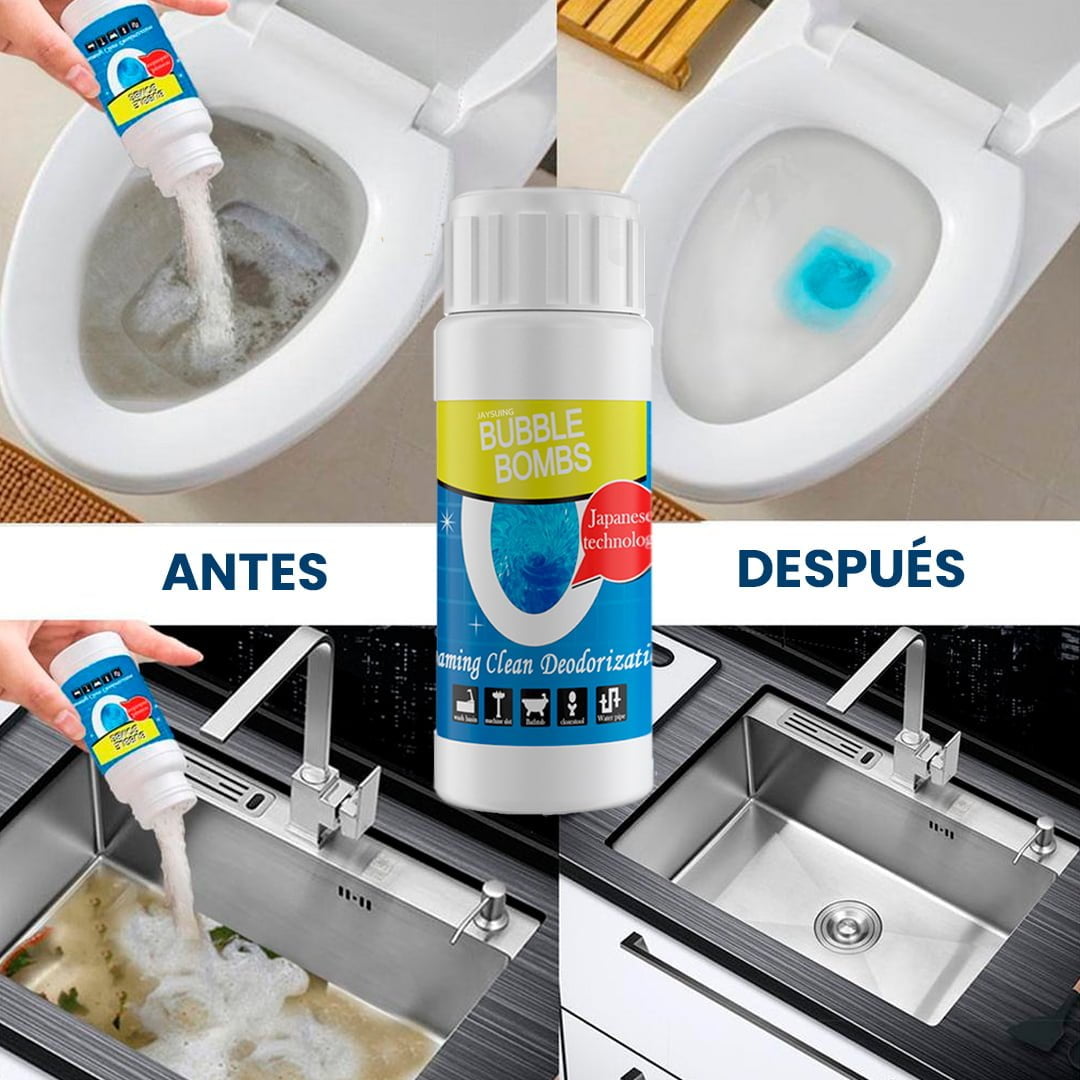 1) Para liberar las tuberías de tu casa solo debes aplicar el Polvo Destapador de drenajes Bubble Bombs en una cantidad suficiente según el tipo de obstrucción. Debes mezclarlo con un poco de agua caliente y listo.